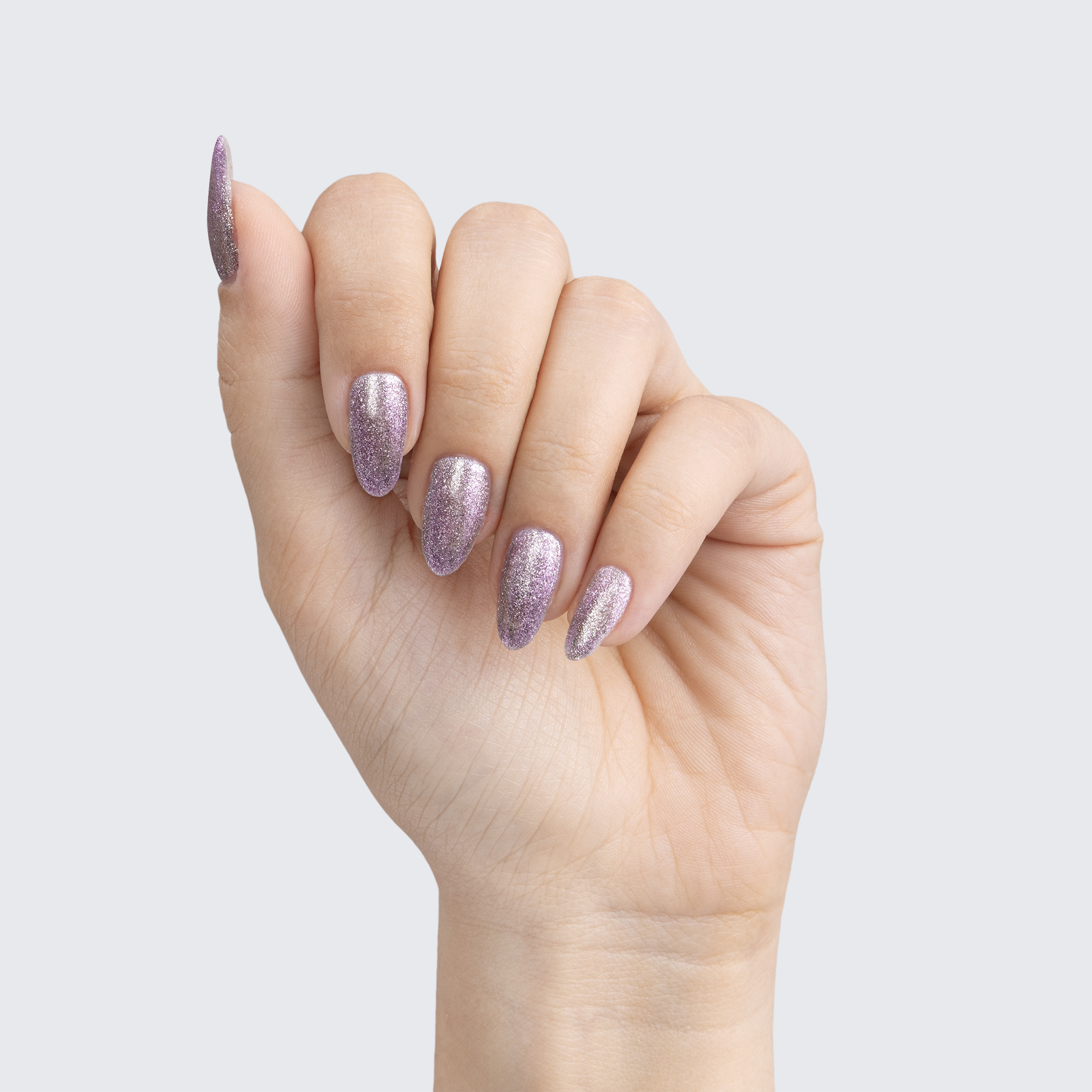 Pale lavender. Metallic foil sparkle. Opaque. Cool undertone.